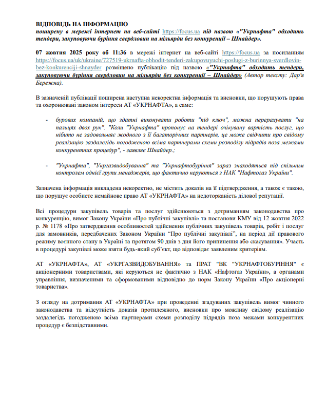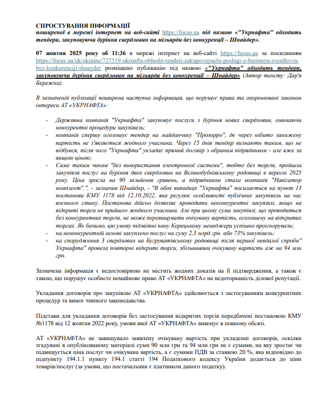 "Учитывая соблюдение АО "УКРНАФТА" при проведении упоминавшихся закупок требований действующего законодательства и отсутствие доказательств обратного, выводы о наличии в данном случае коррупционных рисков являются безосновательными", — говорится в тексте ответа "Укрнафты".