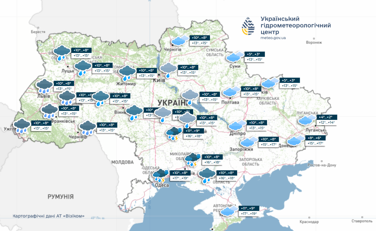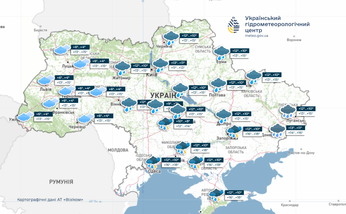 В субботу дождливая погода в Украине будет сохраняться в центре, на севере и на юге, а также ожидается на востоке. На западе будет облачно, преимущественно без осадков. В ночное время термометр будет показывать +8...+10, в дневное в среднем +13...+15.
