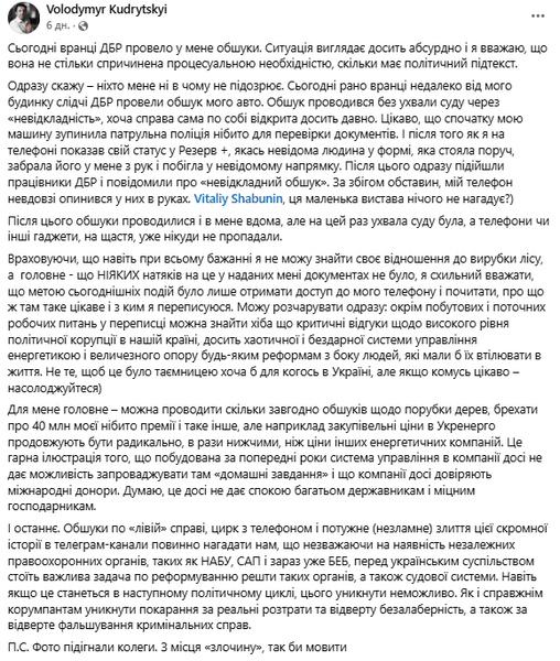 Еще 21 октября ГБР пришло с обысками к Кудрицкому, которому вменяли завышение объемов рубки леса и стоимости подрядных работ при прокладке энергомагистралей. Однако, по информации журналистов, против него открыто уголовное дело и из-за якобы возможных злоупотреблений во время его руководства "Укрэнерго".