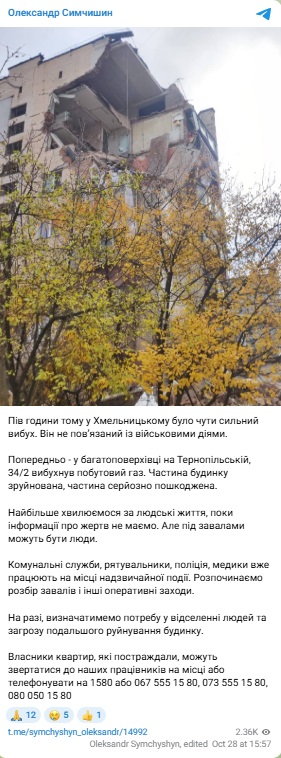Мэр Хмельницка Александр Симчишин подтвердил предварительную версию полиции об утечке газа и написал, что взрыв не связан с военными действиями.