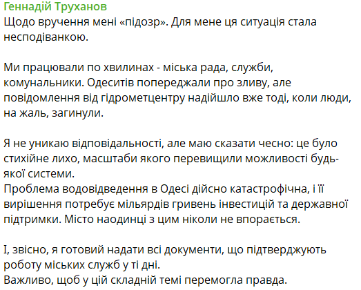 "Мы работали по минутам – городской совет, службы, коммунальщики. Одесситов предупреждали о ливне, но сообщение от Гидрометцентра поступило уже тогда, когда люди, к сожалению, погибли", – написал он.