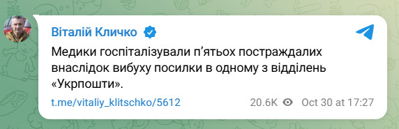 "Медики госпитализировали пятерых пострадавших в результате взрыва посылки в одном из отделений 'Укрпочты'. На месте уже работают следственно-оперативная группа, взрывотехники и медики. Правоохранители устанавливают обстоятельства происшествия", — отметил Кличко.