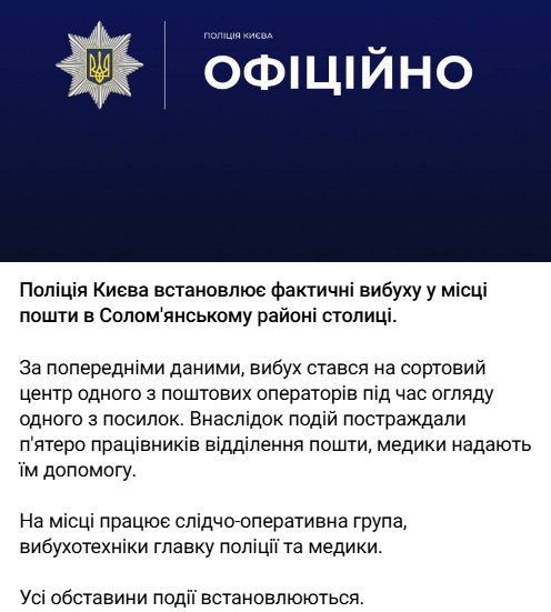 "Полиция Киева устанавливает обстоятельства взрыва в помещении почты в Соломенском районе столицы. По предварительным данным, взрыв произошел на сортировочном центре одного из почтовых операторов во время осмотра одной из посылок. В результате происшествия пострадали пятеро работников отделения почты, медики оказывают им помощь. На месте работает следственно-оперативная группа, взрывотехники главка полиции и медики. Все обстоятельства происшествия устанавливаются", — говорится в официальном сообщении полиции.