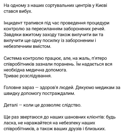 "На одном из наших сортировочных центров в Киеве произошел взрыв. Инцидент произошел во время проведения процедур контроля за пересылкой запрещенных вещей. Благодаря принятым мерам также удалось обнаружить и изъять еще одну посылку с запрещенным и опасным содержимым. Система контроля сработала, но, к сожалению, пятеро сотрудников получили ранения. Им оказывается вся необходимая медицинская помощь. Продолжается расследование. Главное сейчас — здоровье людей. Спасибо медикам за скорую помощь пострадавшим. Детали — когда это позволит следствие. Еще раз обращаюсь к нашим уважаемым клиентам: пожалуйста, не подвергайте опасности наших сотрудников, а также ваших друзей и близких", — подчеркнул Смелянский.