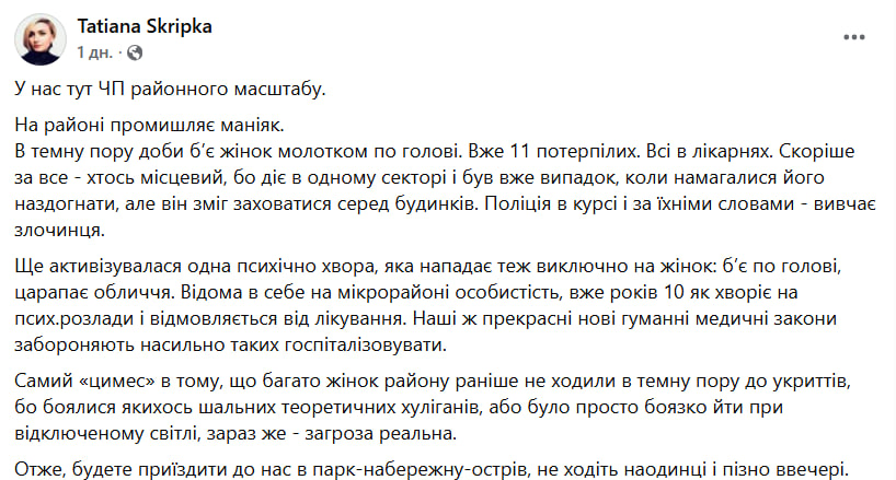 Ранее в Facebook пользовательница под именем Tatiana Skripka опубликовала сообщение, в котором заявила о якобы серии нападений в Оболонском районе. По ее словам, "на районе орудует маньяк", который в темное время суток подходит к женщинам и ударяет их по голове молотком. В сообщении говорилось о по меньшей мере 11 пострадавших, которые якобы находятся в больницах. Автор предположила, что нападающий может быть местным жителем, ведь действует в одном и том же секторе, и даже был случай, когда его пытались преследовать, но он смог незаметно скрыться между домами.