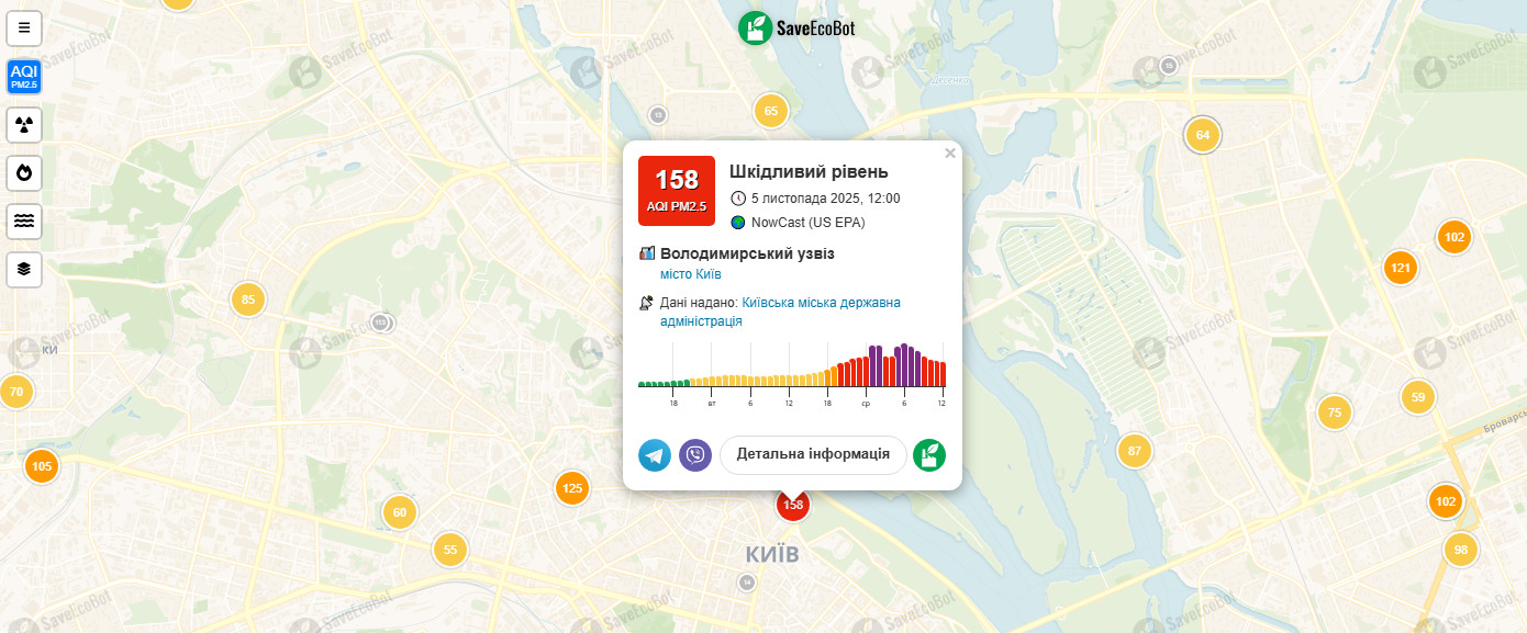 По состоянию на сейчас мониторинг показывает индекс качества воздуха в центре Киева 158 при допустимом уровне 50.