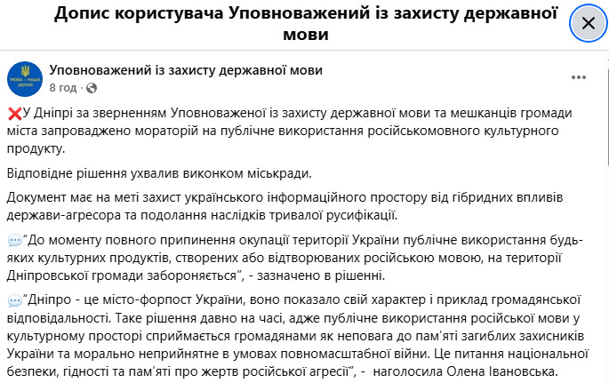 Это решение является частью более широких усилий по борьбе с русификацией на востоке страны. Однако, до момента полного прекращения войны, такое ограничение в культурном пространстве будет действительным на всей территории Днепровской общины.