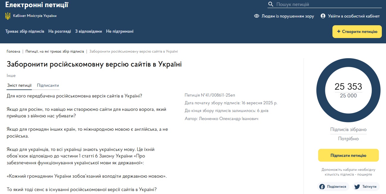 Электронная петиция с требованием заблокировать русскоязычные версии сайтов в Украине набрала свыше 25 голосов, и теперь ее должен рассмотреть Кабинет министров.