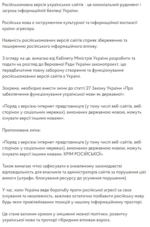 Исходя из этого, он требует от правительства разработать и представить на рассмотрение в Верховную Раду Украины законопроект, предусматривающий полный запрет на создание и функционирование русскоязычных версий сайтов в Украине, а также ввести ответственность для владельцев и администраторов сайтов за нарушение этого требования вплоть до блокировки.