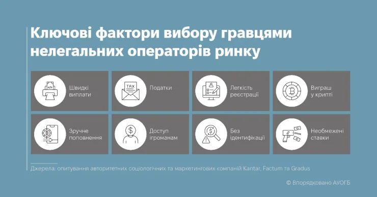В августе-сентябре 2025 года компании KANTAR, Gradus и Factum провели три комплексных исследования уровня тенизации игорной индустрии. Согласно результатам, нелегальный сегмент составляет от 39% до 53% рынка. Репрезентативное исследование среди 2500 респондентов, играющих в интернет-казино, выявило основные факторы, почему украинцы выбирают нелегальные платформы: скорость выплат; отсутствие лимитов на ставки; возможность избегать уплаты налогов; простота регистрации и анонимность; возможность играть с помощью криптовалют; доступ для лудоманов и подростков до 21 года. Исследования показали, что любые ограничения или неудобства в легальных казино приводят к оттоку игроков в нелегальные интернет-казино.