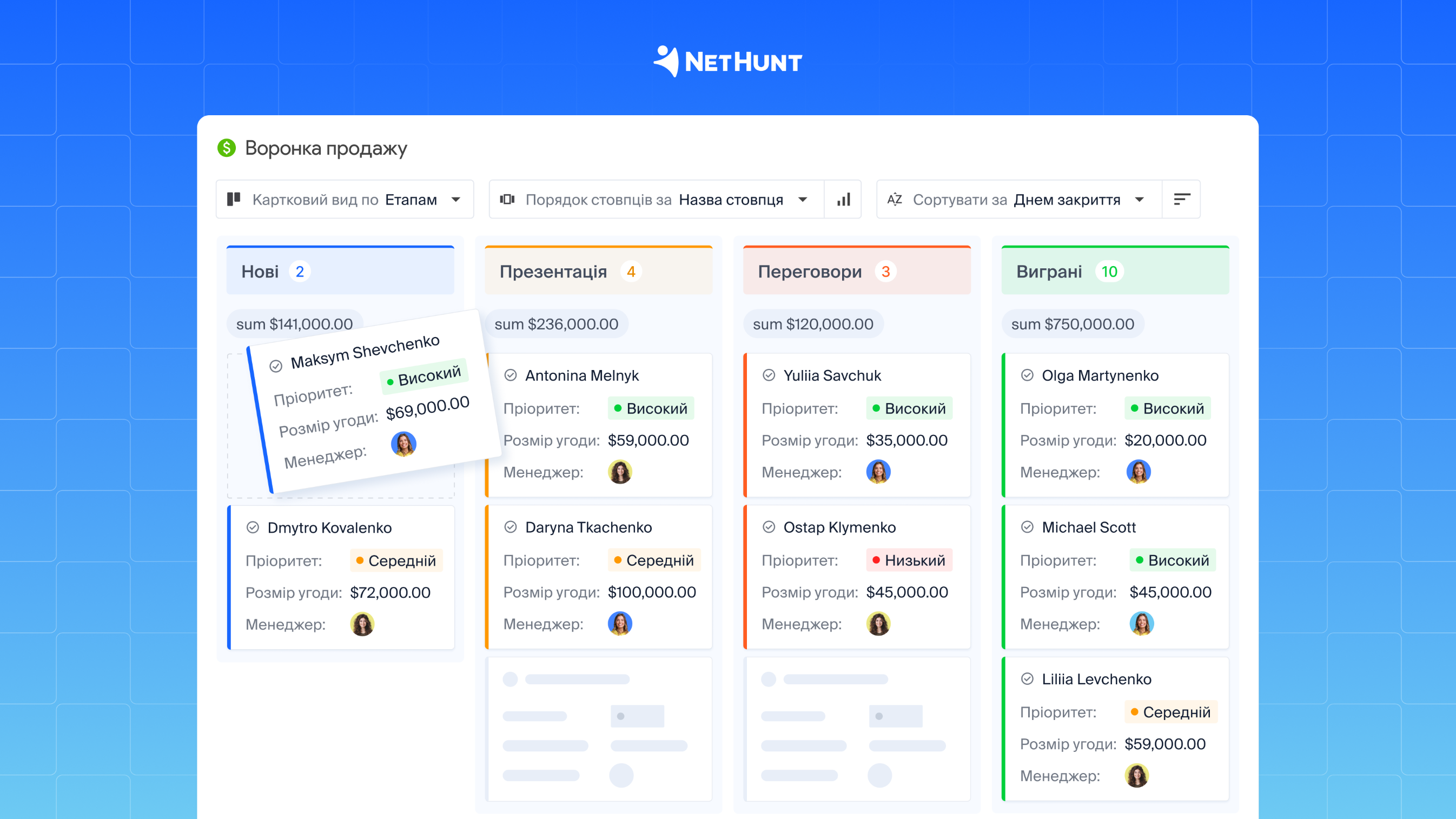 NetHunt CRM робить те, що жоден чат чи таблиця не здатні забезпечити стабільно: