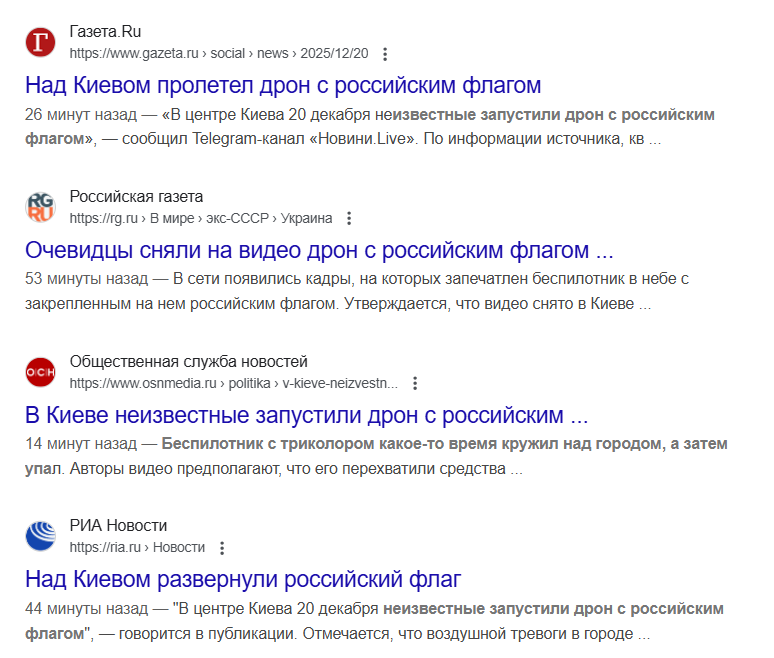 20 декабря жители Киева заметили в небе дрон с флагом Российской Федерации.