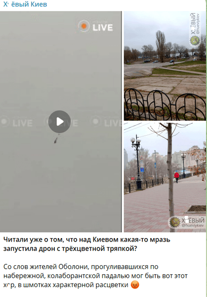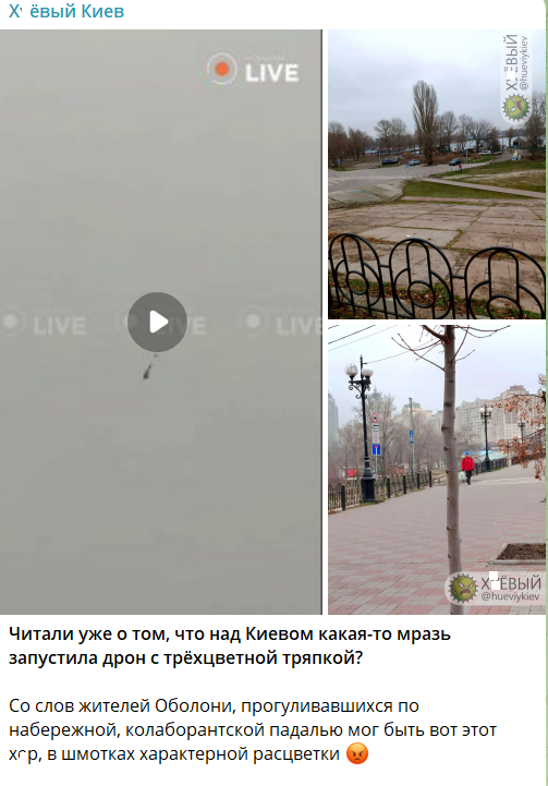 По информации паблика "Х*евый Киев", жители Оболони видели мужчину, который якобы запускал дрон с флагом. Они отметили, что и одежда у него была в стиле триколора РФ.