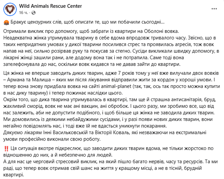 Волк жил у женщины длительное время, и существование в четырех стенах, что является неподходящими условиями для волка, усилили его стресс и спровоцировали агрессию, сообщается на странице центра спасения диких животных (Wild Animals Rescue Center).