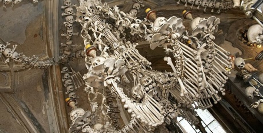 Когда здесь построили часовню Всех Святых с подвальной часовней Душевной агонии Иисуса в Гефсиманском Саду, местное кладбище занимало целых 3,5 гектара: в этом месте покоились 30 тысяч унесенных эпидемией чумы 1318 года, позже к ним добавились и сотни жертв гуситских войн. Переполненный некрополь закрыли, кости извлекли из земли и как попало свалили в подвальной часовне, превратив ее в склеп. Первым, кто решился навести хоть какой-то порядок, стал некий полуслепой монах, в 1511 году сложивший из костей шесть пирамид в честь умерших. Так они и стояли, пока в XVIII веке местные земли не перешли во владение князя Шварценберга. Оформлением часовни и упорядочением останков было поручено заняться известному резчику по дереву Франтишку Ринту. Что он и сделал: все детали интерьера и даже герб Шварценбергов собраны и вырезаны из человеческих костей. Сколько скелетов на это ушло, точно не известно. По некоторым сведениям, около 40 тысяч.