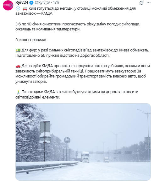 Патрульная полиция Киева накануне вечером сообщила, что в случае существенного усложнения погодных условий возможно ограничение въезда крупногабаритного транспорта в столицу.