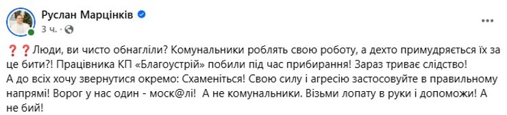 "Люди, вы чисто обнаглели? Коммунальщики делают свою работу, а некоторые умудряются их за это бить?! Работника КП "Благоустрий" избили во время уборки! Сейчас идет следствие! А ко всем хочу обратиться отдельно: Опомнитесь! Свою силу и агрессию применяйте в правильном направлении!" – написал он, напомнив, что сейчас главный враг всех украинцев – российские оккупанты, а не коммунальщики.