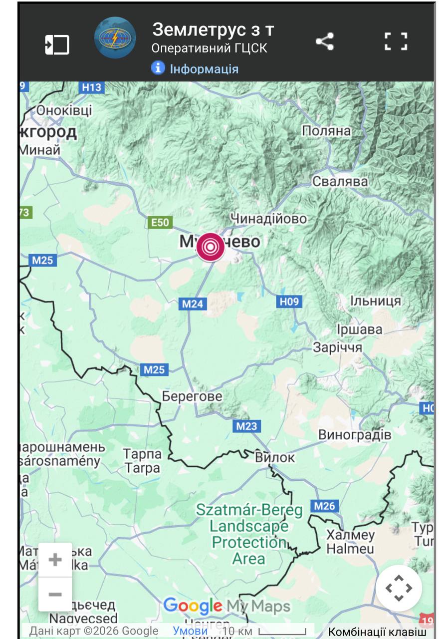 "20 января 2026 года Главным центром специального контроля зарегистрировано землетрясение в районе города Мукачево, Закарпатской области, магнитудой 2,4 (по шкале Рихтера), на глубине 9 км. По классификации землетрясений относится к еле ощутимым", — говорится в сообщении Главного центра специального контроля.