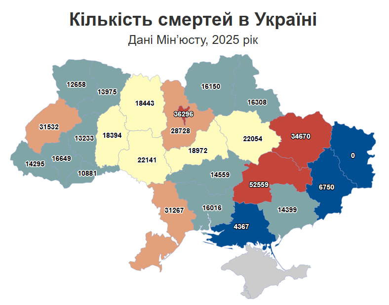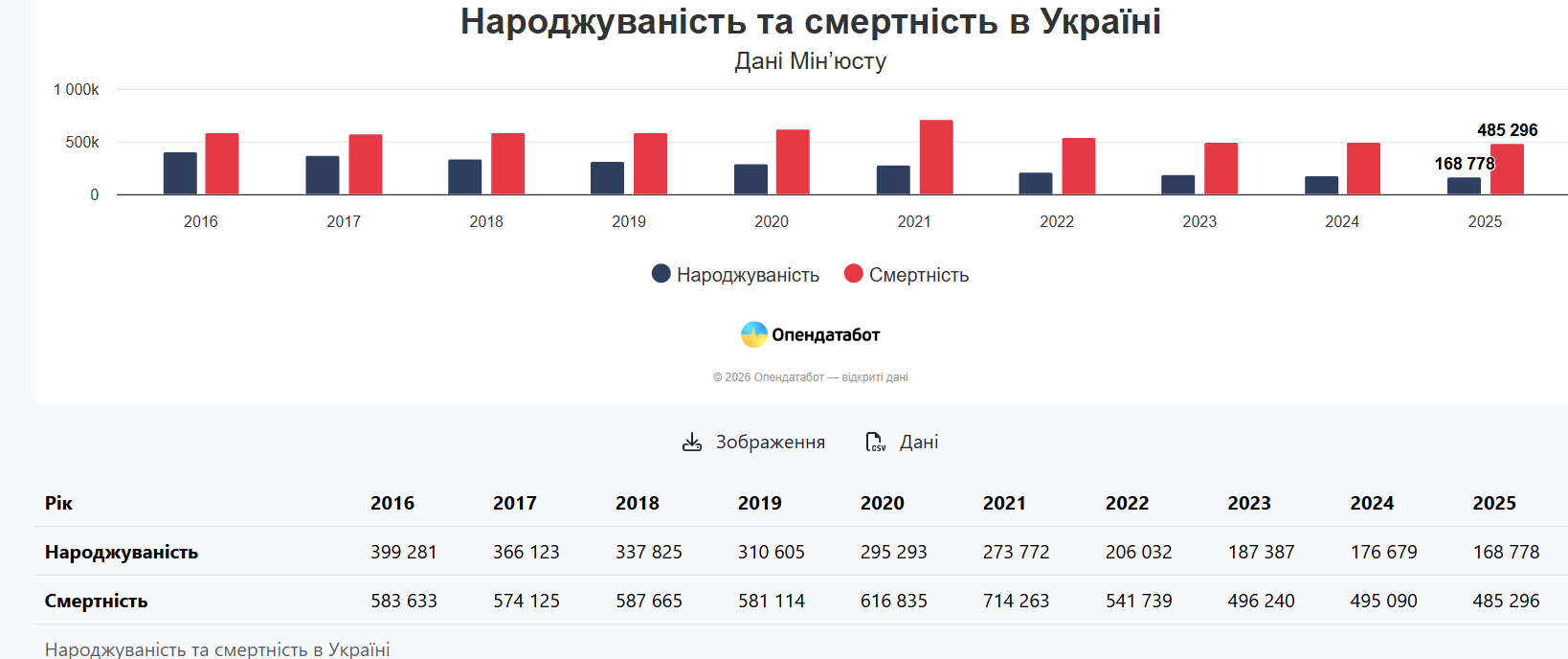 За 2025 год в Украине умерли 485 296 человека, что в целом ниже на 2%. На одного новорожденного приходится трое умерших.