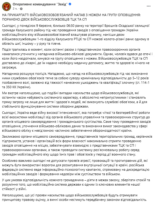 "Особенно важно сегодня не допускать проявлений агрессии, провокаций и противоправных действий, которые могут быть использованы врагом для расшатывания внутренней ситуации в стране. российская федерация системно ведет информационно-психологическую кампанию, направленную на дискредитацию мобилизационных мероприятий и формирование недоверия между обществом и войском. В этих условиях ответственность каждого гражданина — действовать в рамках закона, сохранять спокойствие и понимание того, что мобилизационная система государства является одним из ключевых элементов нашей устойчивости в войне", — говорится в заметке.