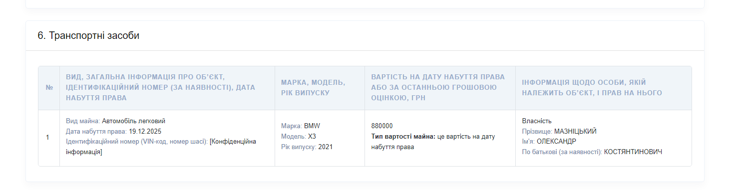 В декларации также указано приобретение нового автомобиля в 2025 году — согласно документу, это BMW X3 2021 года выпуска. Его задекларированная стоимость составляет 880 тысяч гривен, и он оформлен непосредственно на Александра Мазницкого.