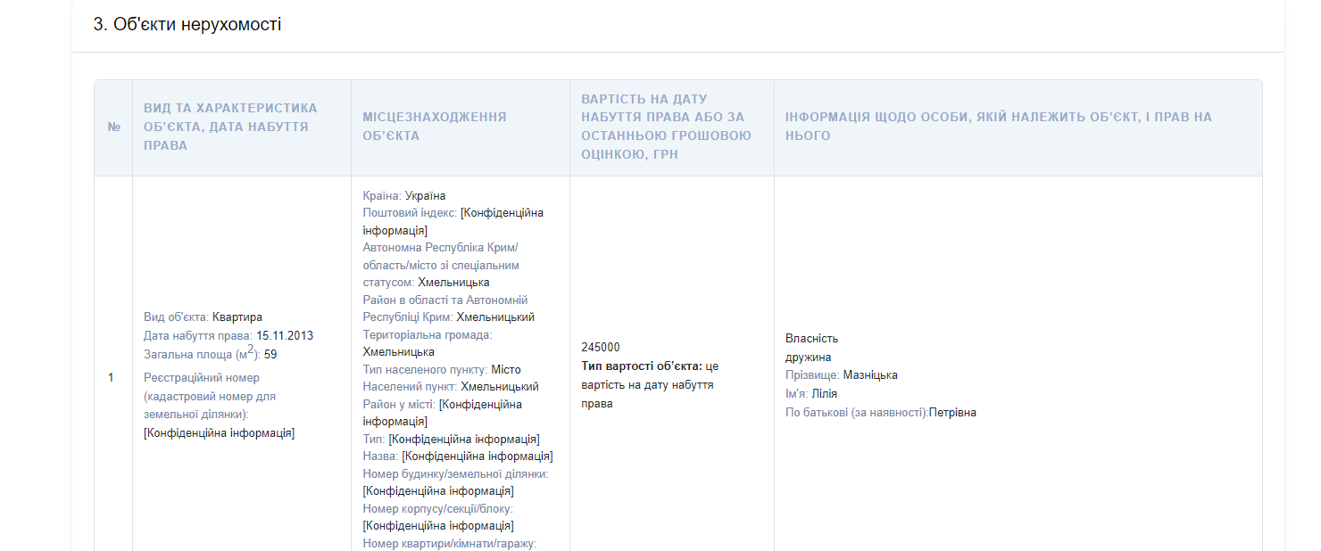 В декларации указано, что жена чиновника владеет двумя квартирами в Хмельницком. Первая квартира имеет площадь 59 квадратных метров, а ее стоимость на момент покупки составляла 245 тысяч гривен. Вторая квартира имеет площадь 46,9 квадратного метра — ее задекларированная стоимость составляет 46 891 гривну.