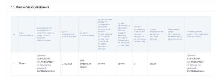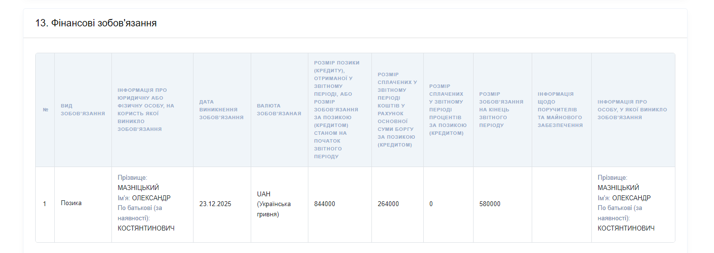 В декларации указано и финансовое обязательство. 23 декабря 2025 года Александр Мазницкий оформил заем у самого себя на сумму 844 тысячи гривен. По состоянию на 1 января 2026 года остаток долга по этому займу составлял 580 тысяч гривен.