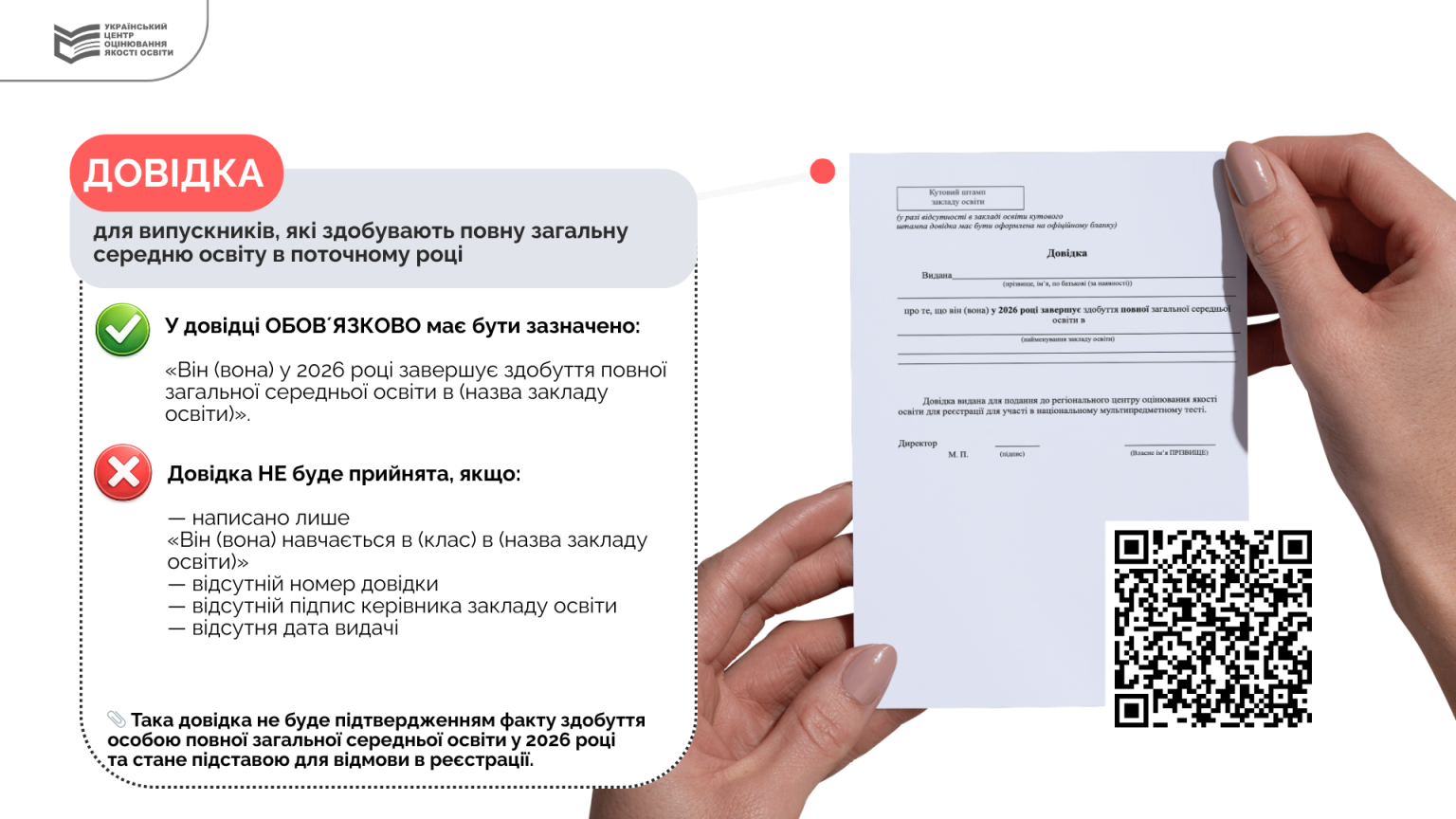 Для выпускников 2026 года таким подтверждением является справка из учебного заведения. В ней должно быть указано, что ученик или ученица именно в 2026 году завершает получение полного общего среднего образования в соответствующем заведении. Если документ оформлен с неправильной формулировкой или в нем отсутствуют обязательные реквизиты — например, номер или дата выдачи — его не засчитают как подтверждение образования, и регистрацию могут временно отклонить до устранения недостатков.