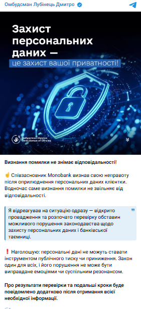 Открыто производство по защите персональных данных и банковской тайны, сообщил в Telegram уполномоченный Верховной Рады по правам человека Дмитрий Лубинец, подчеркнув, что отреагировал на ситуацию сразу.