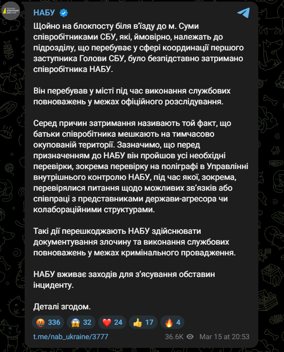Сотрудники Службы безопасности Украины (СБУ) осуществили задержание члена Национального антикоррупционного бюро (НАБУ) на блокпосту вблизи города Сумы. В ведомстве говорят, что это было сделано "безосновательно".