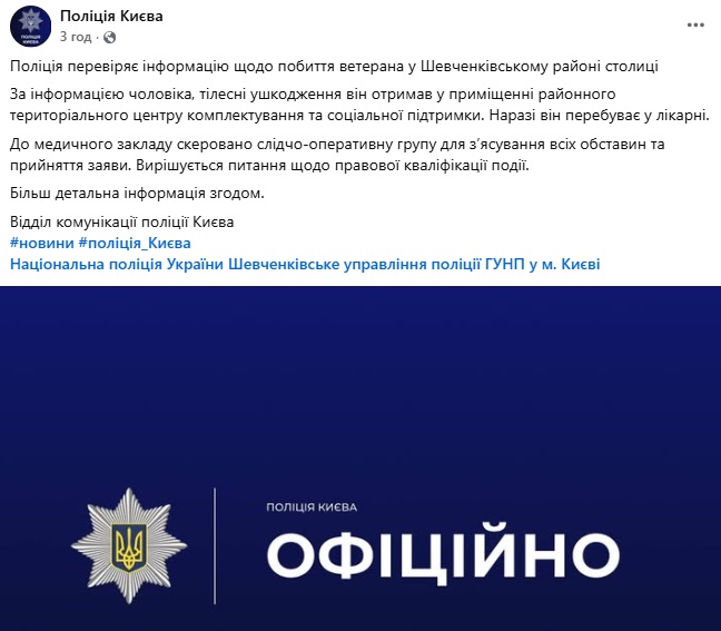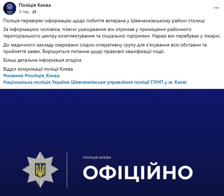 Потерпевший обратился в полицию. Столичные правоохранители подтвердили, что проверяют информацию об избиении ветерана в Шевченковском районе Киева.