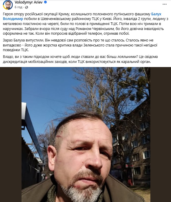 Бывшего политзаключенного Кремля и героя сопротивления российской оккупации Крыма Владимира Балуха, имеющего II группу инвалидности, якобы избили в Шевченковском районном территориальном центре комплектации и социальной поддержки в Киеве.