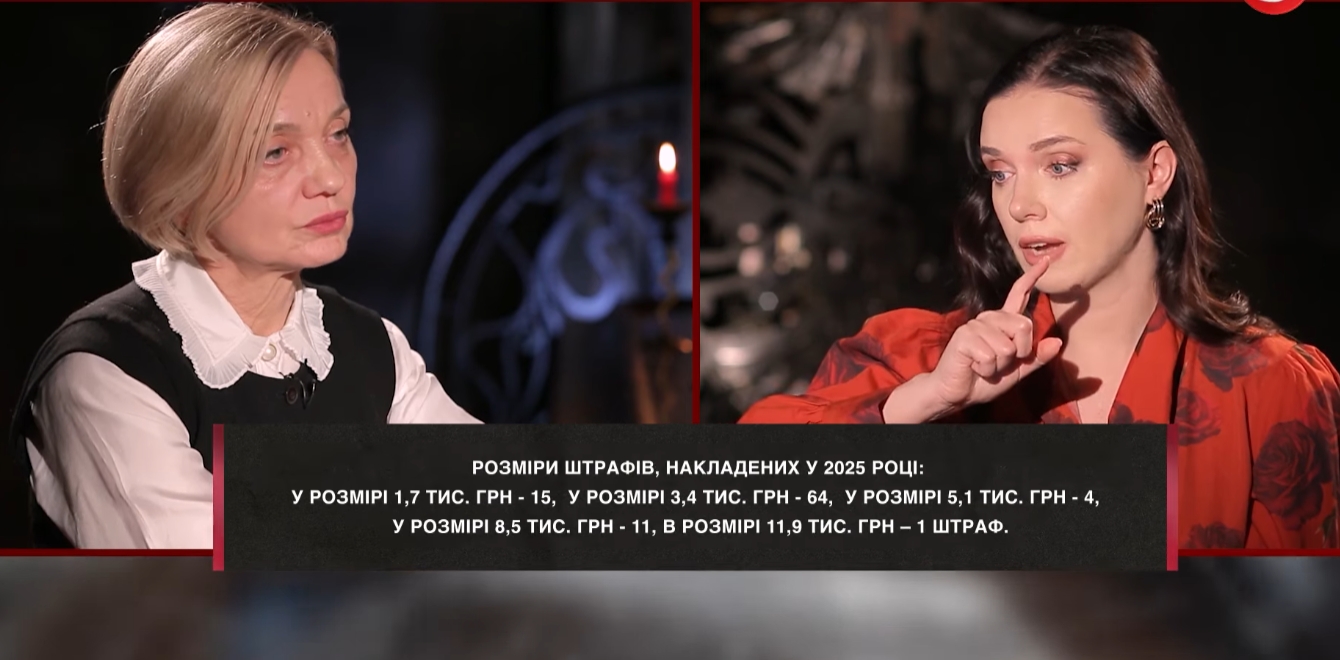 Соколова напомнила, что у нее есть официальная информация по штрафам за 2025 год, когда Елена Ивановская пришла на должность: 95 штрафов на общую сумму 368900 грн за нарушение языкового законодательства.