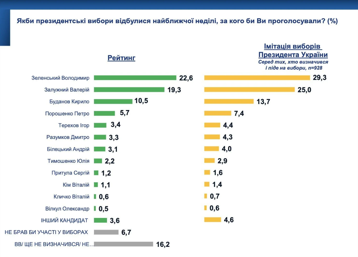 В президентском рейтинге, по данным исследования, первое место занимает Владимир Зеленский с показателем 22,6%, второе — Валерий Залужный, которого поддерживают 19,3% респондентов. Третью позицию занимает Кирилл Буданов с 10,5%. Далее следуют Петр Порошенко — 5,7%, Игорь Терехов — 3,4%, Дмитрий Разумков — 3,3%, Андрей Билецкий — 3,1% и Юлия Тимошенко — 2,2%.