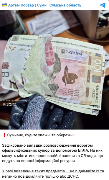 Информацию подтвердил и и.о. городского головы Сум Артем Кобзарь. Он попросил при обнаружении таких купюр обращаться в полицию или ГСЧС и не поднимать их с земли.