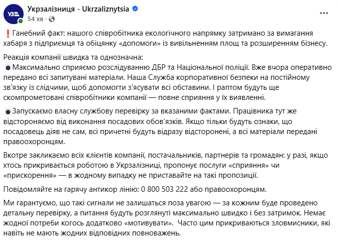 Реакция "Укрзалізниці" не заставила себя ждать. Случившее там назвали "позорным фактом". В УЗ признали, что сотрудник экологического направления задержан за вымогание взятки с предпринимателя и обещание "помощи" с высвобождением площадей и расширением бизнеса.