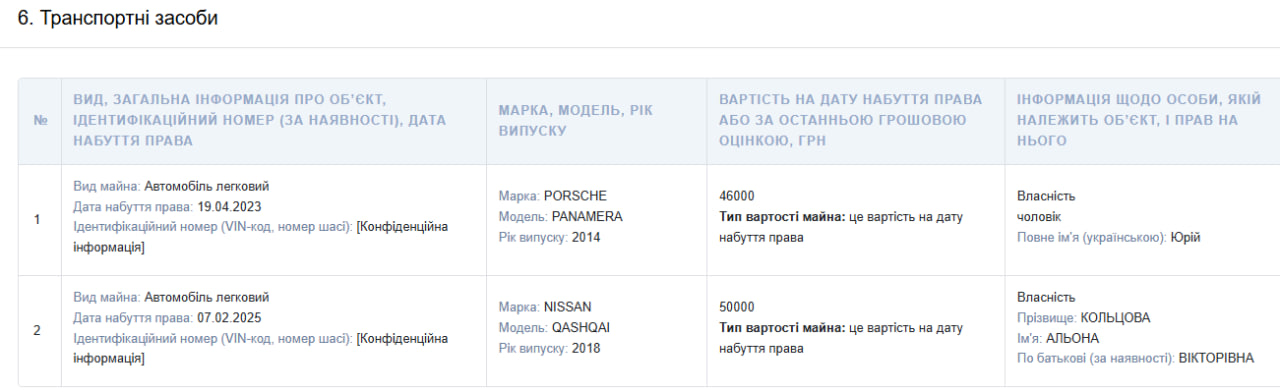 Согласно документу, в 2025 году Кольцова приобрела автомобиль Nissan Qashqai 2018 года выпуска. Если исследовать цены, то можно увидеть, что такой автомобиль стоит около 15-18 тысяч долларов. Однако чиновница купила его за 50 тысяч гривен (около 1,2 тысячи долларов по состоянию на прошлый год).