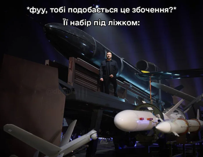 Автор другого мема делает более взрослую шутку, сравнивая украинское вооружение на фото Зеленского с игрушками для взрослых. Фото опубликовал у себя Telegraf.