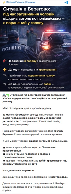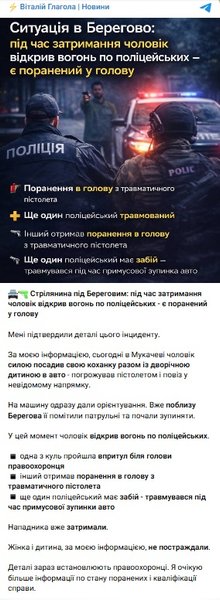 Во время изучения всех обстоятельств происшествия полиция установила, что мужчина приехал к своей 45-летней знакомой в Мукачевский район. Во время ссоры он приставил к голове женщины пистолет и заставил ее вместе с трехлетним ребенком сесть в машину, после чего поехал в Береговский район. Там он пытался похитить еще одного ребенка — собственного внука, а также нанес телесные повреждения своей дочери.