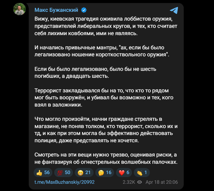 Похожую позицию высказал и народный депутат Максим Бужанский, который подчеркнул, что обсуждение темы оружия после киевских событий является преждевременным и эмоционально окрашенным. Он предостерег, что легализация короткоствольного оружия могла бы привести к еще большему количеству жертв в случае хаотичного применения в условиях стресса и неполной информации. По его мнению, подобные вопросы нужно рассматривать исключительно через призму реальных рисков, а не эмоциональных реакций на трагедии.