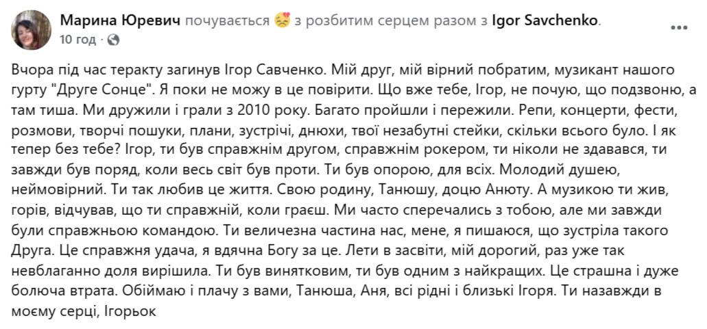"Вчера во время теракта погиб Игорь Савченко. Мой друг, мой верный побратим, музыкант нашей группы "Друге Сонце". Я пока не могу в это поверить", — написала Юревич.