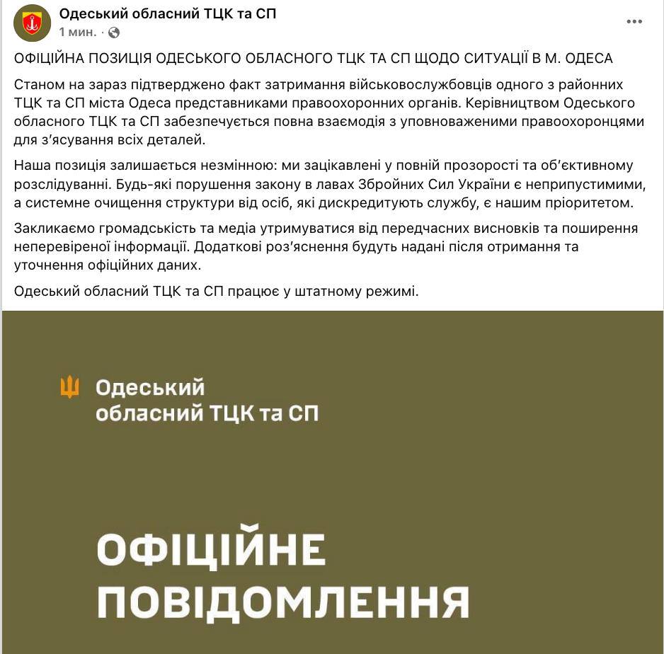 Как сообщили в заметке на официальной странице Одесского областного ТЦК и СП в Facebook 21 апреля, сейчас подтвержден факт задержания военнослужащих одного из районных ТЦК и СП города Одессы правоохранительными органами. В ведомстве отметили, что руководство областного центра комплектования полностью взаимодействует со следователями и способствует установлению всех обстоятельств инцидента.