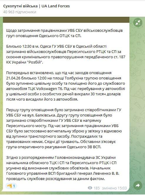 В первой версии поста говорилось, что сотрудники СБУ задержали военных за совершение уголовного преступления по статье разбой. В ней также говорилось, что группа оповещения задержала гражданского и посадила его в автомобиль. Во время пребывания мужчины в авто, у него похитили 30 тысяч долларов и высадили из автомобиля.