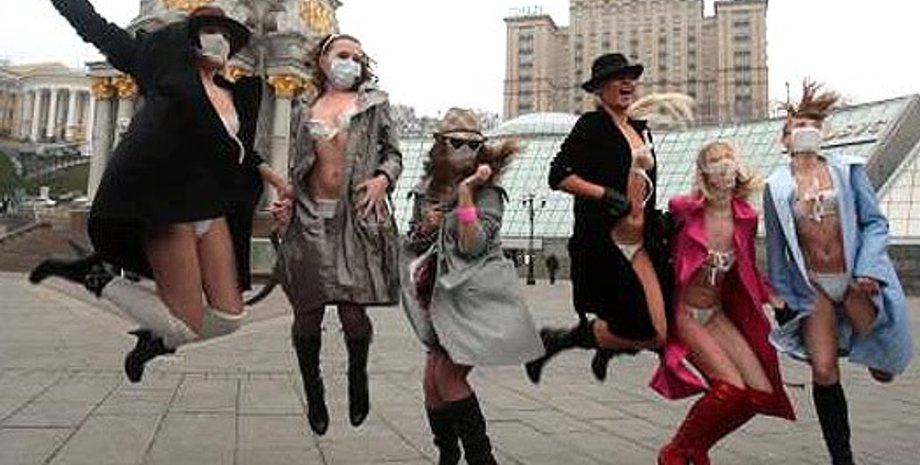 Возле памятника архангелу Михаилу на площади Независимости девушки боролись с окологриппозной паникой с помощью "позитивной шокотерапии". Изначально участницы акции были одеты традиционно для сегодняшнего Киева – в плащи и марлевые повязки на лицо. Когда же девушки распахнули плащи, выяснилось, что те же повязки можно использовать еще и в качестве нижнего белья.