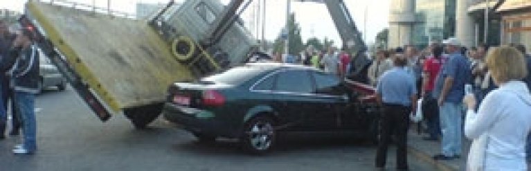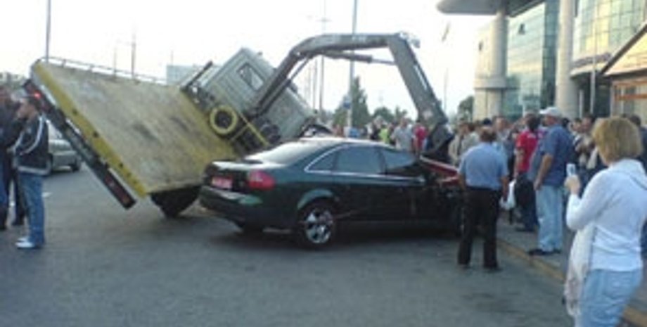 На Южном вокзале Киева муниципальный эвакуатор при попытке эвакуации Ауди А6, обвалился на стоящие машины. Стрела эвакуатора приземлилась на лобовое стекло Ауди, а кабина на припаркованный рядом Дэу Ланос.