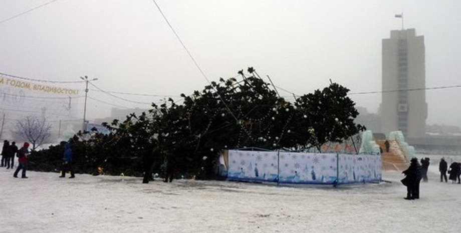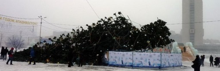 Сильный порывистый ветер, обрушившийся на Владивосток в среду вместе со снегопадом, повалил главную новогоднюю елку на центральной площади города