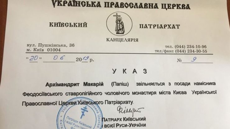 Бывший патриарх УПЦ КП Филарет издал указ об увольнении настоятеля Свято-Феодосиевского монастыря в Киеве архимандрита Макария (Папиша) за то, что тот отказался принять участие в т.н. "соборе" КП.