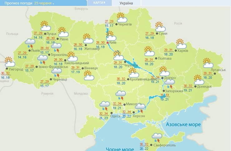 По ее данным, 25-го июня максимальная температура воздуха будет оставаться высокой на Юге и Востоке Украины, 30-34°.