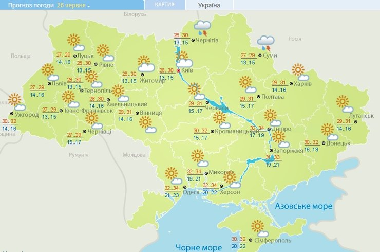 В большинстве областей ожидается 27-32°, в Карпатах 20-25°.