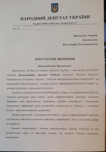 Группа народных депутатов обратилась к президенту Украины Владимиру Зеленскому с просьбой посмертно наградить Дмитрия Тымчука орденом Свободы. Официальное обращение опубликовал народный депутат Антон Геращенко в Facebook.